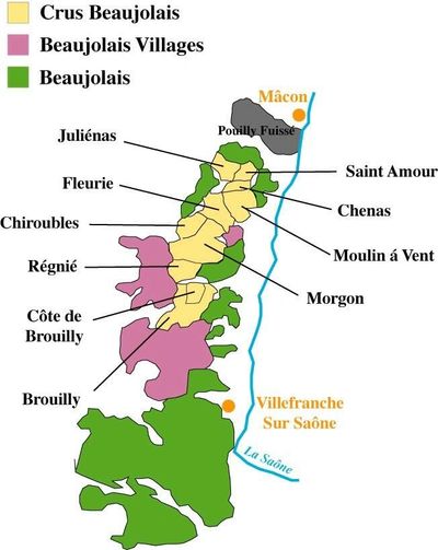 There are three quality levels in Beaujolais. The first is generic Beaujolais. Next, in its northern region are thirty-nine villages distinguished by superior vineyards. Beaujolais-Villages, is made from grapes from any one or a number of these thirty-nine communes. Beaujolais-Villages is noticeably more concentrated than regular Beaujolais. Finally, the pinnacles of Beaujolais are ten specific crus, from villages whose vineyards are considered to be the best. Wine from these villages is made from grapes grown only from within the specific village. Moulin a Vent, the crème de la crème of Beaujolais derives its name from the historic windmill located in the vineyard.